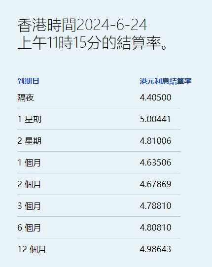 智通财经APP获悉,6月24日,港元拆息近全线上扬,与楼按相关的一个月拆息报4.63506%,升4.196基点,创近3个月高;反映银行资金成本的三个月拆息报4.7881%,升3.203基点。