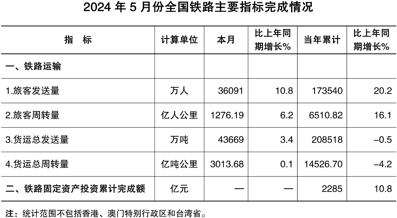 智通财经APP获悉,6月24日,据国家铁路局消息,5月,全国铁路旅客发送量36091万人,同比增长10.8%。铁路固定资产投资累计完成2285亿元,同比增长10.8%。