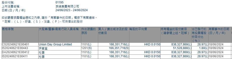 智通财经APP获悉,香港联交所最新资料显示,6月18日,杜云增持京维集团(01195)1.66351716亿股,每股作价0.015港元,总金额约为249.53万港元。增持后最新持股数目为8.38亿股,最新持股比例为28.97%。