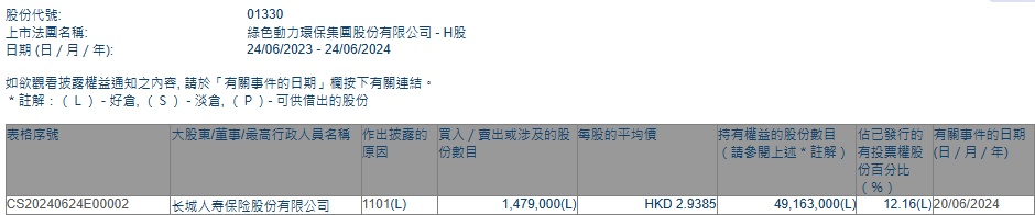 智通财经APP获悉,香港联交所最新资料显示,6月20日,长城人寿保险股份有限公司增持绿色动力环保(01330)147.9万股,每股作价2.9385港元,总金额约434.6万港元。增持后最新持股数目为4916.3万股,最新持股比例为12.16%。
