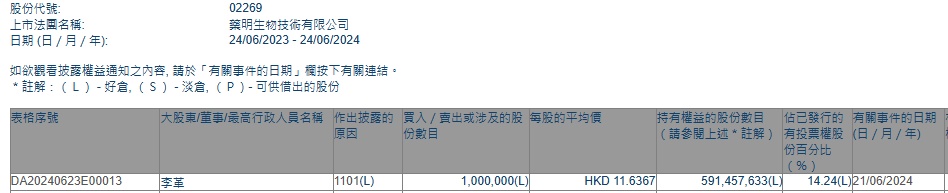智通财经APP获悉,据香港联交所最新资料显示,6月21日,非执行董事兼主席李革增持药明生物(02269)100万股,每股作价11.6367港元,总金额为1163.67万港元。增持后最新持股数目约为5.9亿股,持股比例为14.24%。