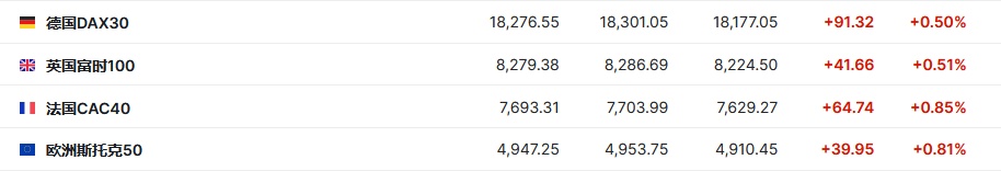 2. 截至发稿,德国DAX指数涨0.50%,英国富时100指数涨0.51%,法国CAC40指数涨0.85%,欧洲斯托克50指数涨0.81%。