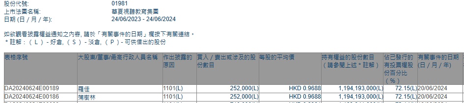 智通财经APP获悉,香港联交所最新资料显示,6月20日,蒲树林增持华夏视听教育(01981)25.2万股,每股作价0.9688港元,总金额约24.41万港元。增持后最新持股数目约为11.94亿股,最新持股比例为72.15%。