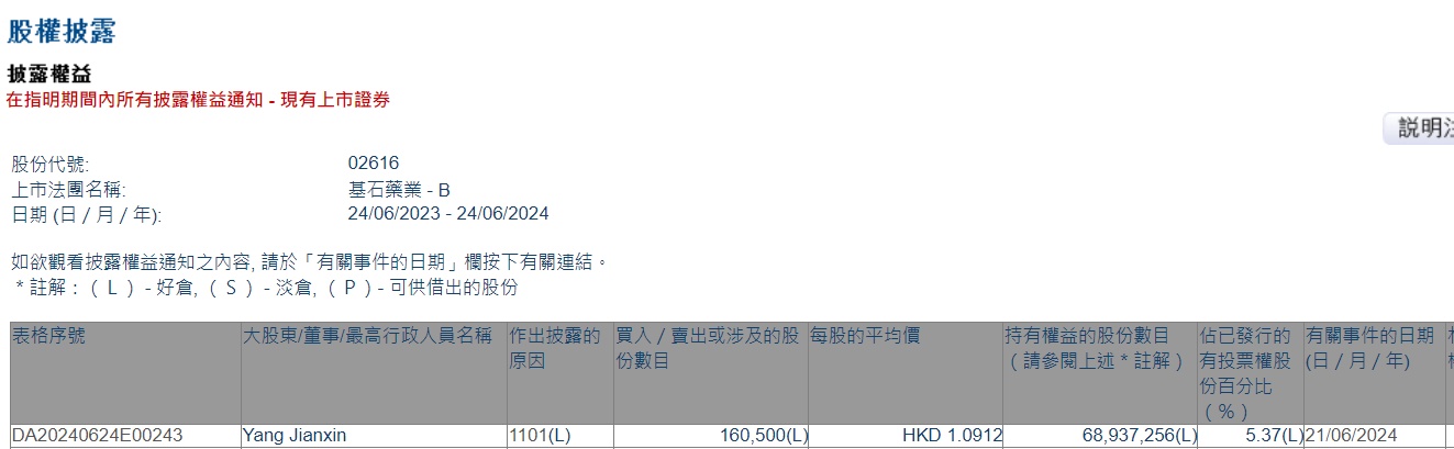 智通财经APP获悉,香港联交所最新资料显示,6月21日,CEO杨建新增持基石药业(02616)16.05万股,平均每股作价为1.0912港元,总金额约17.52万港元。增持后最新持股数目约为6893.73万股,持股比例为5.37%。