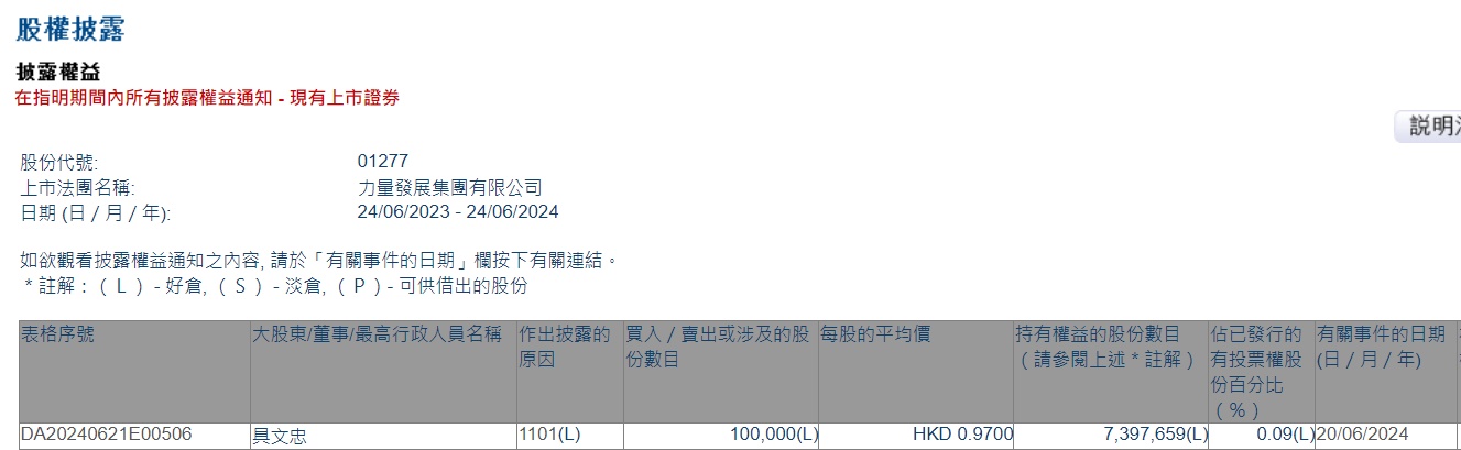 智通财经APP获悉,香港联交所最新资料显示,6月20日,董事会主席兼执行董事具文忠增持力量发展(01277)10万股,平均每股作价为0.97港元,总金额约9.7万港元。增持后最新持股数目约为739.77万股,持股比例为0.09%。