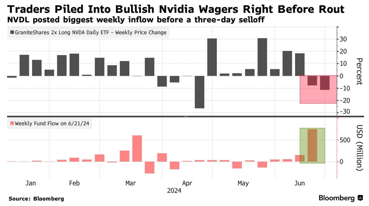 GraniteShares 2x Long NVDA每日ETF(NVDL.US)的日涨跌幅是英伟达的两倍。上周,随着投资者寻求扩大这只被称为全球“最重要股票”的股票的涨幅,该ETF的资金流入达到了创纪录的7.43亿美元。事实证明,这个时机并不合适,该基金自周二收盘以来已下跌约25%。到2024年,该基金仍上涨了约329%。