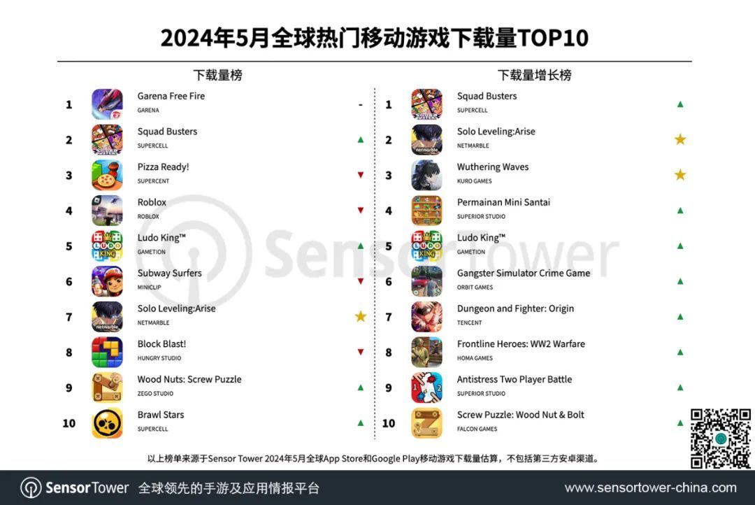 5月,三款新手游在下载增长榜上占了一席之地:Netmarble《Solo Leveling:Arise》、Kuro Games《Wuthering Waves》和由腾讯发行的《地下城与勇士:起源》。