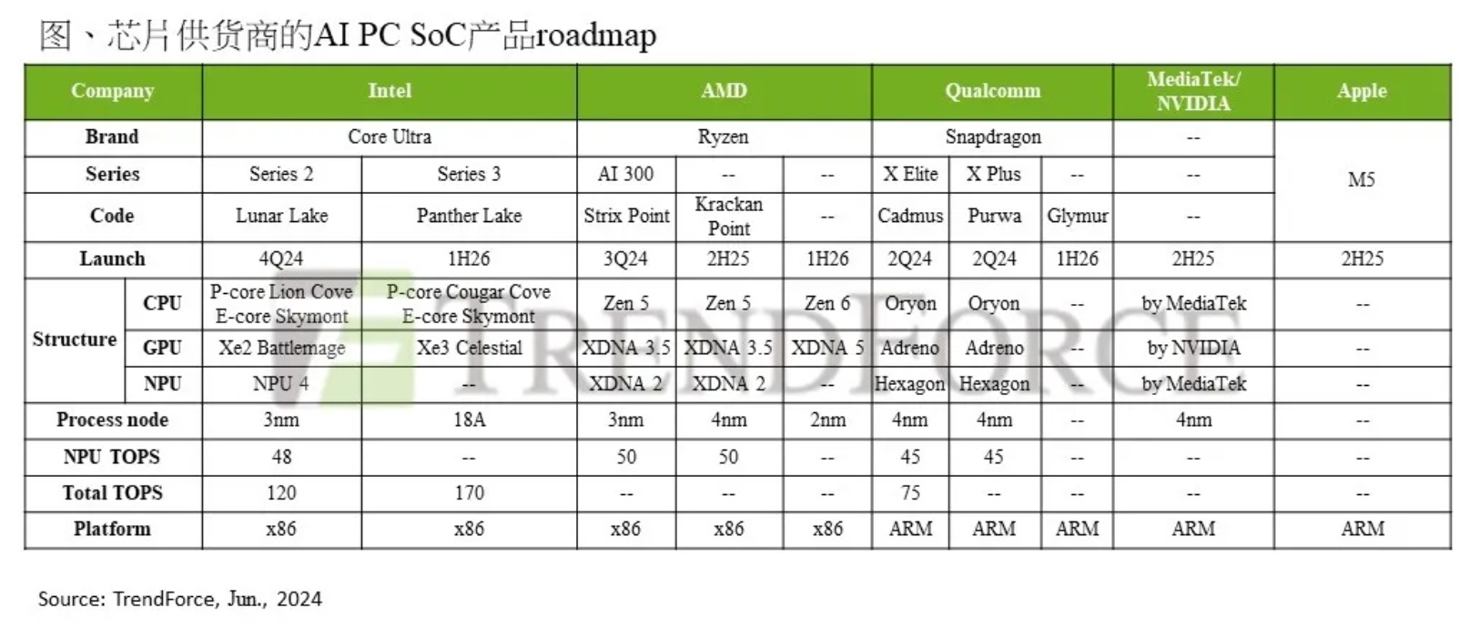 观察近期芯片厂在AI PC的布局,Intel的Lunar Lake及AMD的Strix Point都是在本月COMPUTEX展会首次发布的SoC,并都符合AI PC标准,故尽管Lunar Lake及Strix Point所配套的PC机种分别预计于今年第四季及今年第三季才上市,PC OEM会场工作人员仅以口头说明该两类机种的规格表现,但该两款SoC及所搭载的PC机种仍为活动中市场主要关注焦点。