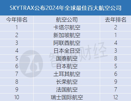 智通财经APP获悉,近日,被称为航空界奥斯卡的英国航空运输评级机构SKYTRAX公布2024年全球最佳百大航空公司。其中,国泰航空(00293)连升3级,排名第5位。同时,在2024年全球最佳经济客舱票选中,国泰航空荣获第一名;此外,国泰航空还被评为全球最干净航空,以及亚洲区最佳的经济舱机上餐饮。