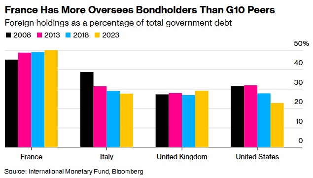 Hirt表示,法国官员必须让外国投资者相信,法国的财政状况良好,否则法国国债将面临新一轮被抛售的风险。他表示,海外投资者持有的法国国债比其他国家国债的规模要大得多,一些人担心当前的政治动荡可能引发欧洲债务危机,且程度与十多年前的债务危机不相上下。