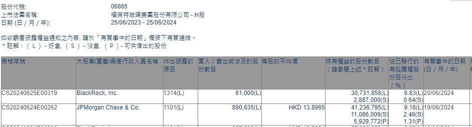 智通财经APP获悉,香港联交所最新资料显示,6月19日,摩根大通增持福莱特玻璃(06865)89.0635万股,每股作价13.8965港元,总金额约为1237.67万港元。增持后最新持股数目约为4123.68万股,最新持股比例为9.16%。