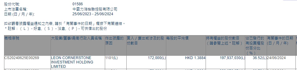 智通财经APP获悉,香港联交所最新资料显示,6月24日,LEON CORNERSTONE INVESTMENT HOLDING LIMITED增持力鸿检验(01586)17.2万股,平均每股作价1.3884港元,总金额约为23.88万港元。增持后最新持股数目为1.98亿股,持股比例为36.52%。