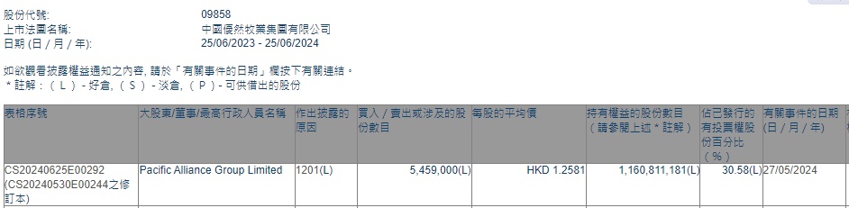 智通财经APP获悉,香港联交所最新资料显示,5月27日,PACIFIC ALLIANCE GROUP LIMITED减持优然牧业(09858)545.9万股,每股作价1.2581港元,总金额约为686.80万港元。减持后最新持股数目约为11.61亿股,最新持股比例为30.58%。