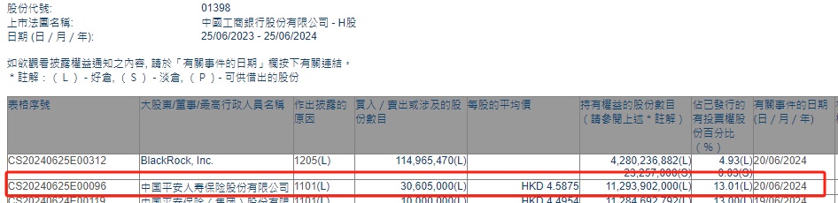 智通财经APP获悉,香港联交所最新资料显示,6月20日,中国平安保险(集团)股份有限公司增持工商银行(01398)3060.5万股,每股作价4.5875港元,总金额约1.4亿港元。增持后最新持股数目约为112.94亿股,最新持股比例为13.01%。