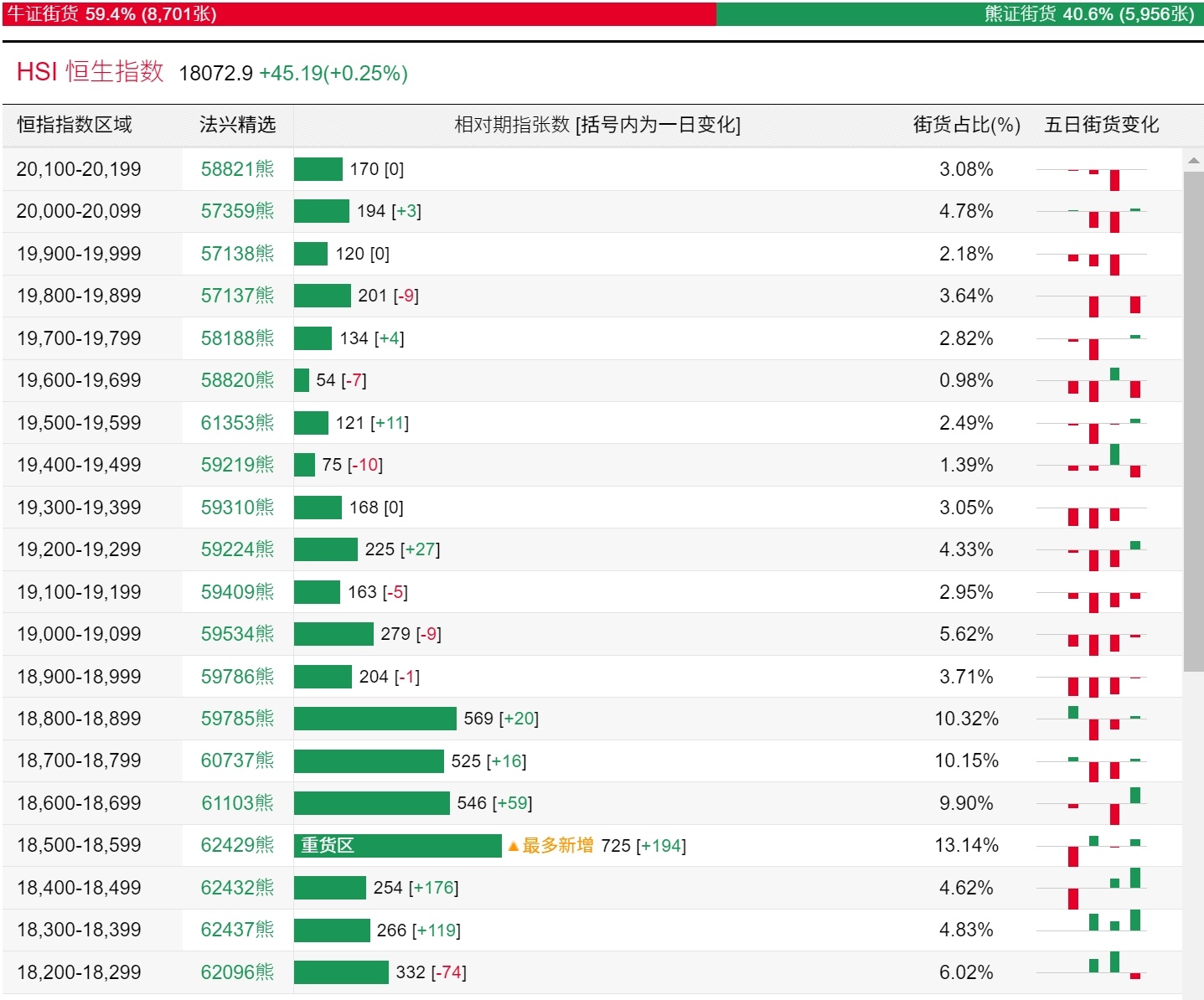 法兴恒指牛熊证街货分布图中的数据显示,熊证街货重货区和最多新增都在18500-18599区间,该区间最新熊证数量为725张,较上一交易日增加194张。