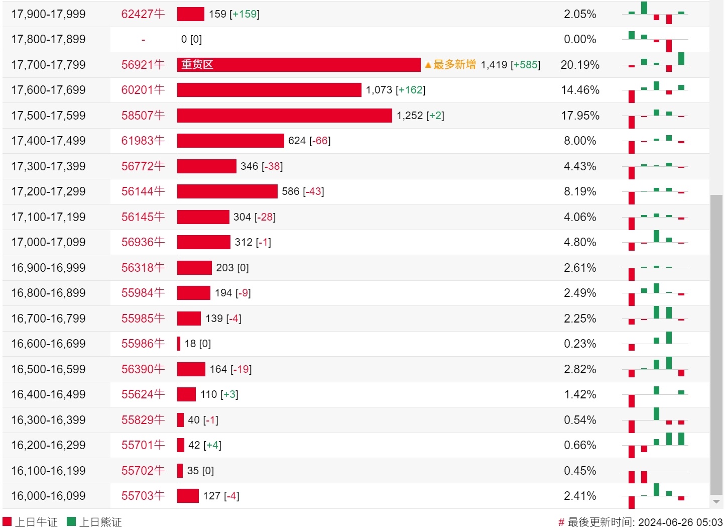 牛证街货重货区和最多新增都在17700-17799区间,该区间最新牛证数量为1419张,较上一交易日增加585张。
