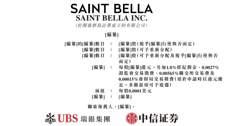智通财经APP获悉,据港交所6月25日披露,SAINT BELLA INC. (圣贝拉)向港交所主板提交上市申请,瑞银集团和中信证券为其联席保荐人。