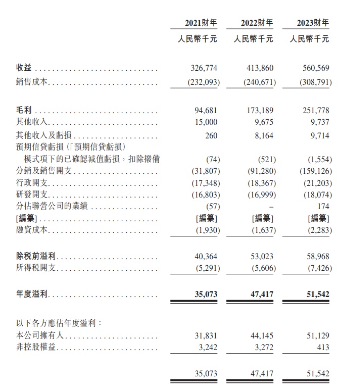财务方面,于2021年、2022年及2023年,公司的收益分别约为人民币3.27亿元、4.14亿元以及5.61亿元;同期,年度溢利分别约为人民币3507.3万元、4741.7万元以及5154.2万元。