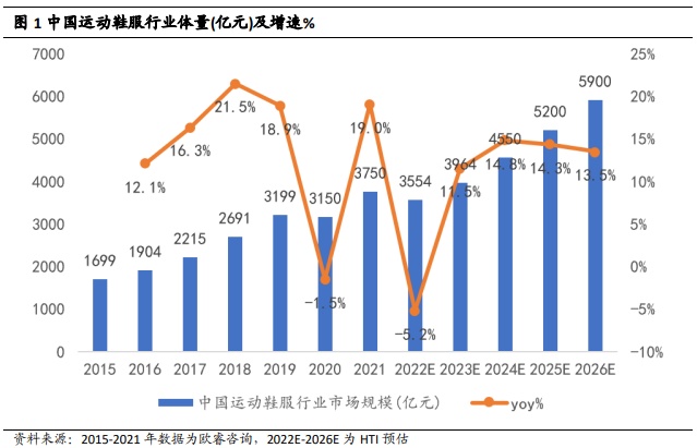 回看中国运动鞋服市场的发展历程,行业在疫情前其实便已高度集中。但在后疫情时代,由于库存积压,行业竞争烈度走高,集中度有所下降。与此同时,在经历连续的高增长之后,运动鞋服市场的增速也出现了放缓的态势。根据欧睿咨询数据,剔除2020年因为疫情扰动较低的行业增速,2015至2021年运动鞋服的平均行业增速在17-18%。另据预测,2022-2026年中国体育用品市场的年均增长率为9.9%,若剔除2022年因为疫情影响导致的-5.2%的行业增速,2023-2026年的行业平均增速为13.5%,亦较2021年之前的高双位数增速有所降速。
