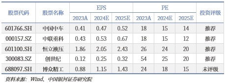 建议2024年下半年重点关注(1)大规模设备更新带来的投资机遇,包括铁路装备、机床、工程机械及船舶等,(2)装备出海,包括消费类机械、工程机械等,(3)新质生产力带来的新技术新产业孕育的新机会如人形机器人、低空经济、可控核聚变等。结合业绩增长及估值,核心组合为:中国中车、中联重科、恒立液压、创世纪、博众精工。