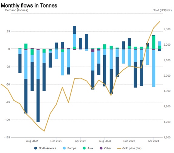 截止至5月,全球黄金ETF持有3087.9吨黄金。黄金ETF管理的资产规模(AUM)升至2,340亿美元,增长2%。资产管理规模的增长是由于金属仓位增加和金价上涨的共同作用。这是自2022年4月以来全球黄金支持基金报告的最高资产管理规模。
