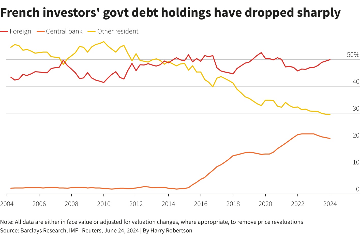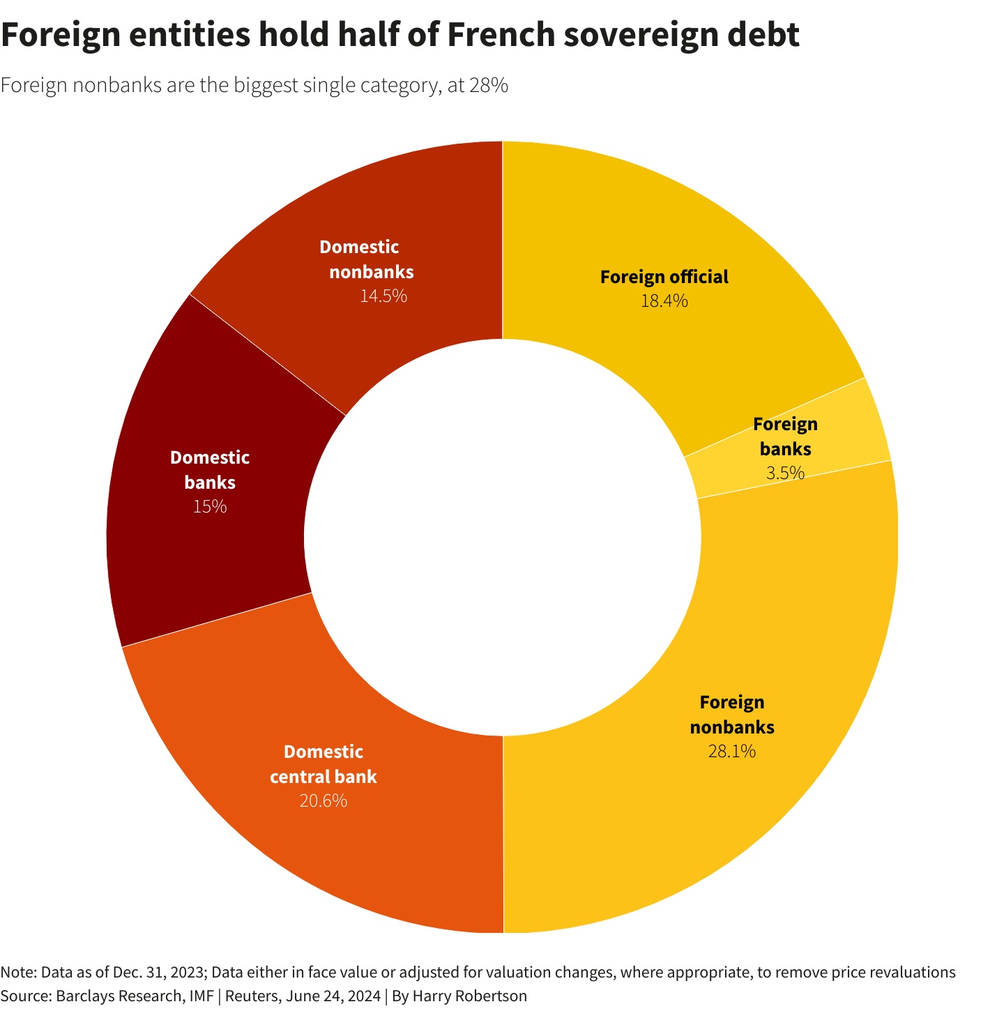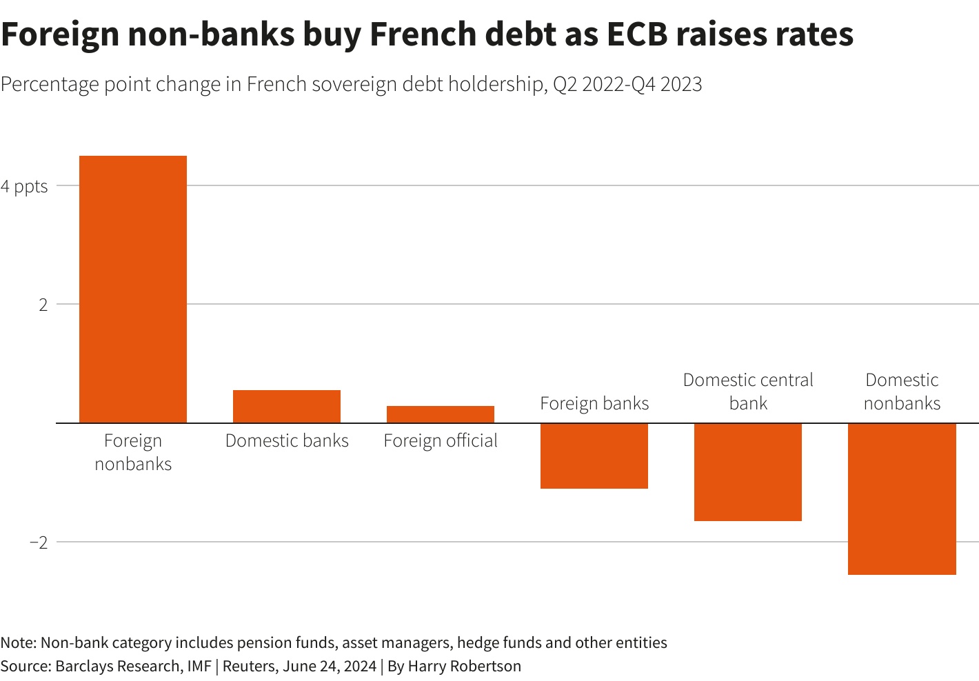 巴克莱指出,自2022年年中欧洲央行开始加息以来,海外非银行投资者(包括资产管理公司、养老基金、对冲基金)一直是法国国债的最大买家。