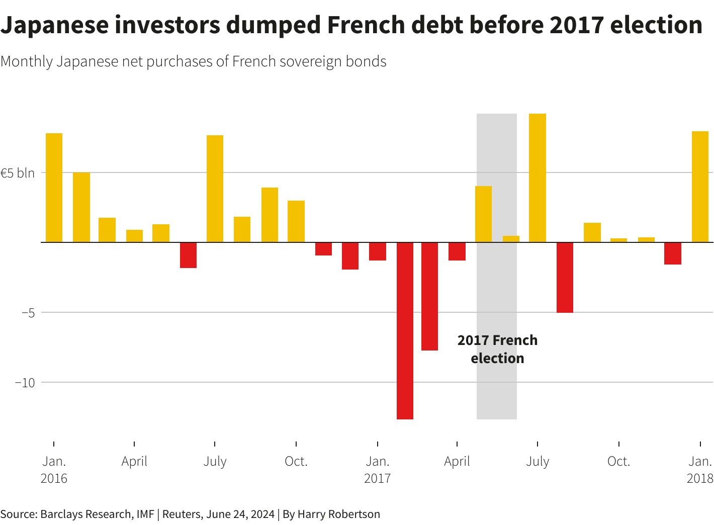 对法国国债来说,日本投资者是一个关键因素。作为外国债券的大买家,日本投资者在欧洲的大部分资产都在法国。在七年前,极右翼政党国民联盟的领导人勒庞在总统大选中曾承诺让法国退出欧盟、脱离欧元区。尽管勒庞在这次总统大选中落败,但日本投资者在这次大选之前卖出了创纪录的约260亿欧元法国政府债券。