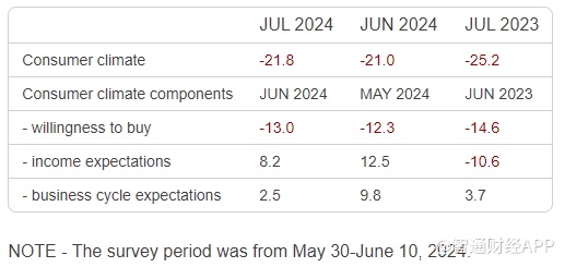 据了解,消费者信心指数预测下个月实际私人消费的情况。该指标高于零,表明私人消费同比增长,低于零则表明同比下降。