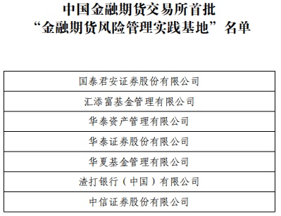 会上,国泰君安证券股份有限公司、汇添富基金管理有限公司、华泰资产管理有限公司、华泰证券股份有限公司、华夏基金管理有限公司、渣打银行(中国)有限公司和中信证券股份有限公司等7家机构成为中金所首批“金融期货风险管理实践基地”。作为“中长期资金风险管理计划”(“长风计划”)机构储能模块的重要内容,中金所将依托7家实践基地,在典型案例挖掘、市场培育、行业研究等方面深化合作,促进其发挥示范带动作用,推动各类机构提升风险管理能力。