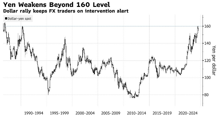 官方数据显示,此前,在日元兑美元汇率跌至34年低点后,日本在4月26日至5月29日期间花费了创纪录的9.8万亿日元(612亿美元)来支撑日元,超过了其在2022年用于捍卫日元的总额。日元的走势表明,干预情况在4月29日和5月1日发生过。