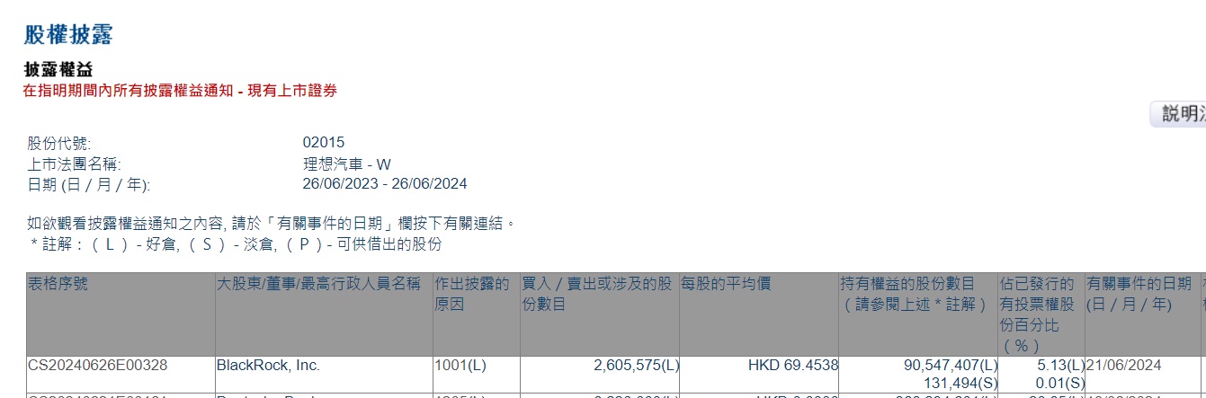 智通财经APP获悉,据香港联交所最新资料显示,6月21日,贝莱德增持理想汽车-W(02015)260.5575万股,每股作价69.4538港元,总金额约1.81亿港元。增持后最新持股数目约为9054.74万股,持股比例为5.13%。