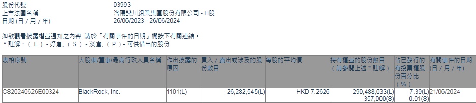 智通财经APP获悉,香港联交所最新资料显示,6月21日,贝莱德增持洛阳钼业(03993)2628.2545万股,每股作价7.2626港元,总金额约为1.909亿港元。增持后最新持股数目约为2.90亿股,最新持股比例为7.39%。