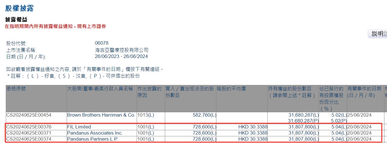 智通财经APP获悉,香港联交所最新资料显示,6月20日,富达国际增持海吉亚医疗(06078)72.86万股,每股作价30.3388港元,总金额约为2210.48万港元。增持后最新持股数目为3180.78万股,最新持股比例为5.04%。