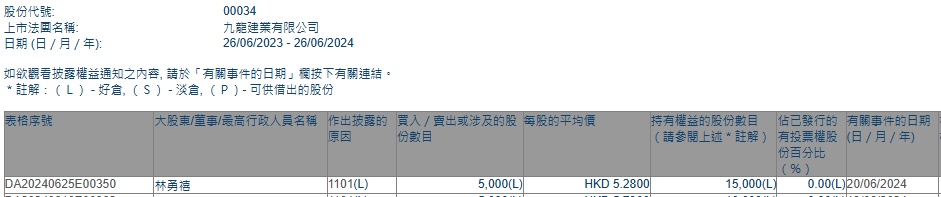 执行董事林勇禧增持九龙建业(00034)5000股 每股作价5.28港元