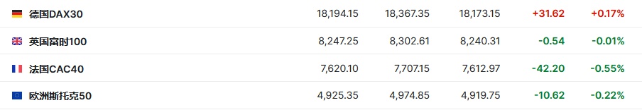 2. 截至发稿,德国DAX指数涨0.17%,英国富时100指数跌0.01%,法国CAC40指数跌0.55%,欧洲斯托克50指数跌0.22%。