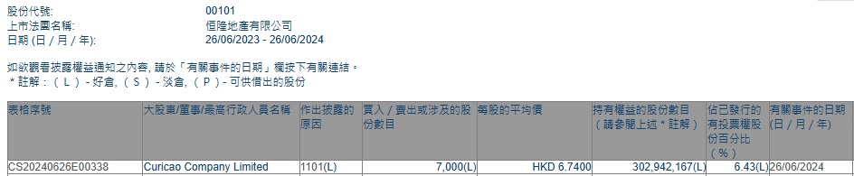 智通财经APP获悉,香港联交所最新资料显示,6月26日,Curicao Company Limited增持恒隆地产(00101)7000股,每股作价6.74港元,总金额约为4.72万港元。增持后最新持股数目约为3.03亿股,最新持股比例为6.43%。