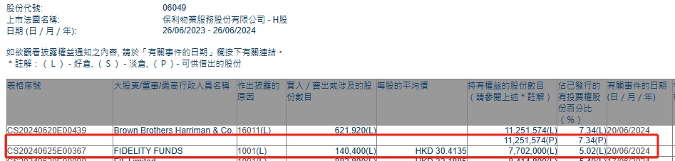 智通财经APP获悉,香港联交所最新资料显示,6月20日,FIDELITY FUNDS增持保利物业(06049)14.04万股,每股作价30.4135港元,总金额约为427.01万港元。增持后最新持股数目为770.2万股,最新持股比例为5.02%。