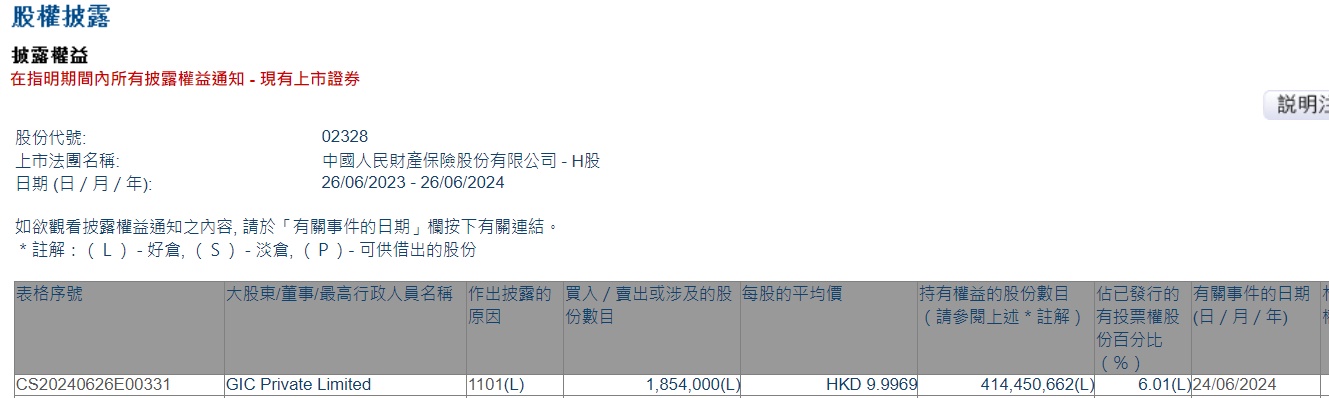Limited增持中国财险(02328)185.4股,每股作价9.9969港元,总金额约为1853.43万港元。增持后最新持股数目约为4.14亿股,最新持股比例为6.01%。