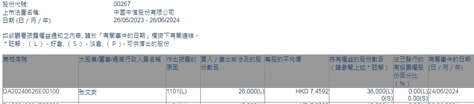 副董事长、总经理张文武增持中信股份(00267)2.6万股 每股作价7.46港元