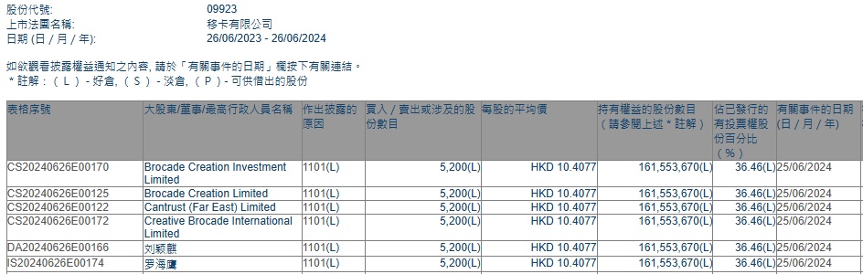 智通财经APP获悉,香港联交所最新资料显示,6月25日,Creative Brocade International Limited增持移卡(09923)5200股,每股作价10.4077港元,总金额约为5.41万港元。增持后最新持股数目约为1.62亿股,最新持股比例为36.46%。