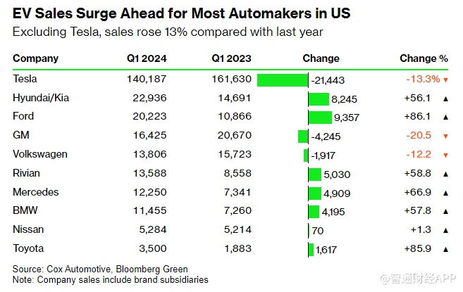 自2015年Model S豪华轿车超过日产Leaf以来,特斯拉一直是美国最畅销的电动汽车品牌。自2018年Model 3起飞以来,特斯拉的电动汽车销量超过了该行业其他公司的总和。但在最初的缓慢反应之后,传统汽车制造商一直在稳步缩小差距。今年第一季度,特斯拉的销量同比下降了13%,而十大电动汽车制造商中有六家的销量却以惊人的速度增长,其中现代/起亚飙升56%,福特汽车(F.US)飙升86%。4月和5月延续了这一趋势。