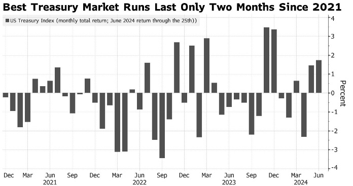 由于连续两个月的上涨,美国国债市场已经接近盈亏平衡,这使得基准国债指数在2024年上半年仅下跌0.15%。自2021年以来,美国国债一直未能实现连续两个月以上的上涨,美债的目前涨势若想延续,将需要持续的数据表明美国经济放缓和通胀走软,因为这将增加美联储最快将在9月份降息的可能性。