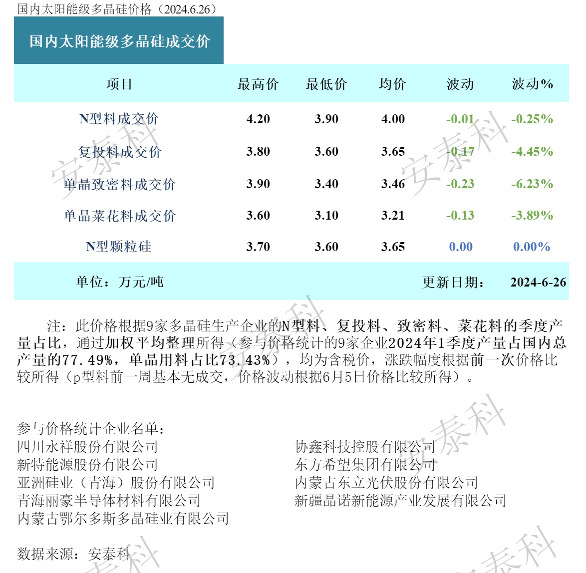 硅业分会发文称,本周多晶硅价格小幅下调。n型棒状硅成交价格区间为3.90-4.20万元/吨,成交均价为4.00万元/吨,环比下跌0.25%;单晶致密料成交价格区间为3.40-3.90万元/吨,成交均价为3.46万元/吨,相较前两次报价下跌6.23%。n型颗粒硅成交价格区间为3.60-3.70万元/吨,成交均价为3.65万元/吨,环比持平。