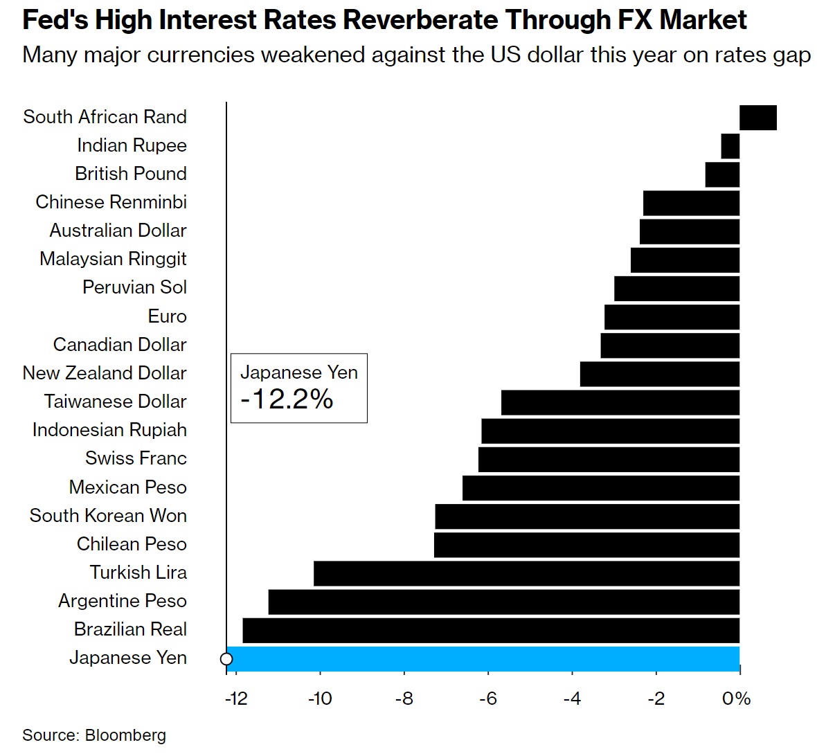 全球投资者在分析居高不下的美国借贷成本是如何支撑美元的,以及这对世界其他地区的影响时,都认识到了这一点。在日交易量达7.5万亿美元的全球货币市场上,日元的无情溃败是美国金融主导地位的极端体现。