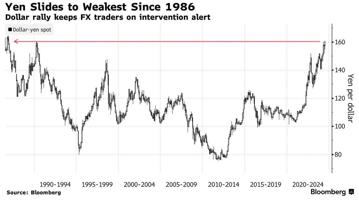 日元则是另一番景象,兑美元汇率一度下挫0.7%,至1美元兑160.87日元,超过了日本官员4月份干预市场的水平。日元兑欧元汇率跌至171.80,创历史新低。在这些举措中,日本最高货币官员 Masato Kanda 重申,当局正在紧急关注外汇市场,并将在必要时采取适当措施。