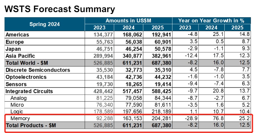 WSTS表示,2024年的预期修订反映了过去两个季度的强劲表现,特别是在计算终端市场。2023年市场大幅萎缩之后,WSTS预计2024年,主要将有两个核心芯片产品类别将推动2024年实现两位数级别的销售额增幅,分别是包含CPU以及GPU在内的逻辑芯片类别总销售额增长10.7%,以及DRAM和NAND所主导的存储芯片类别有望在2024年激增76.8%。