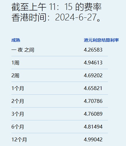 智通财经APP获悉,6月27日,虽然半年结逼近,但港元拆息持续偏软,其中,隔夜息微跌至4.26583%,一周拆息失守5%,低见4.94613%,为6月21日以来最低,与楼按相关的一个月拆息连跌两天,报4.65821%。