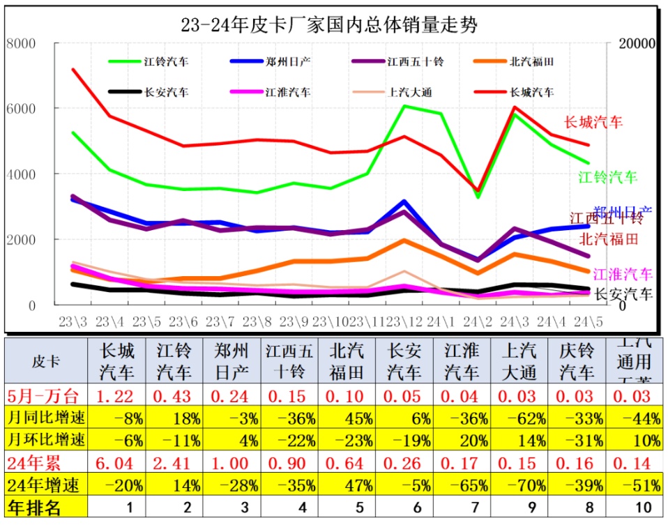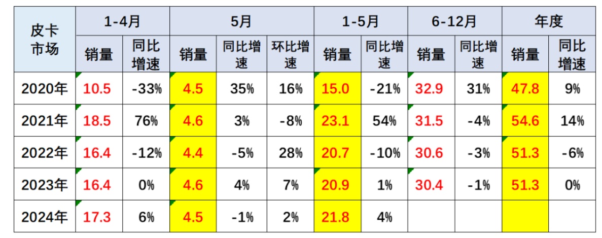 今年1-5月皮卡销量21.8万辆,实现同比增长4%,总体表现不错。