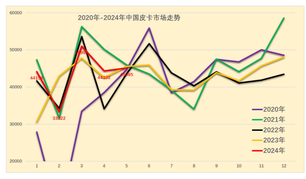 2024年皮卡批发市场走势比较强,1月开局较强,3月冲刺的高点相对温和,5月4.5万走势较强。2023年相对于历年的春节早,因此2-5月持续高位。今年4-5月的皮卡走势因春节较晚因素在春节后有更好表现。