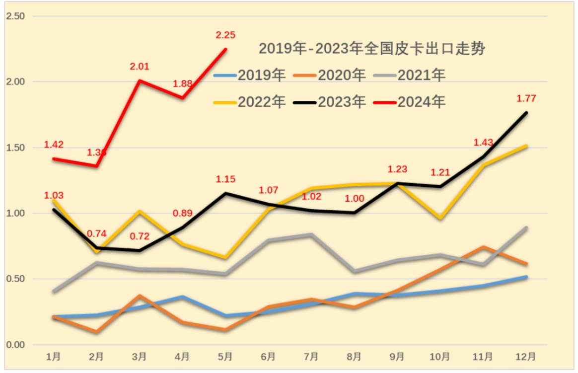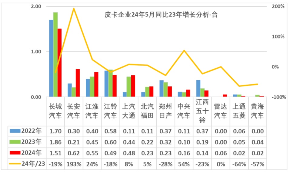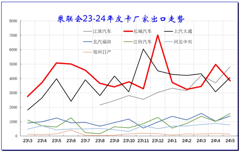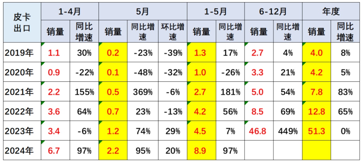 日,乘联分会发文称,由于国际车企的生产不足,供需矛盾大,中国与欧美各国的关系保持良好,中国汽车的海外市场需求暴增,推动2022年以来的中国皮卡出口持续增长,2024年1-5月出口仍呈现同比较强增长态势,其中长城汽车、上汽大通、江淮汽车等出口表现超强。